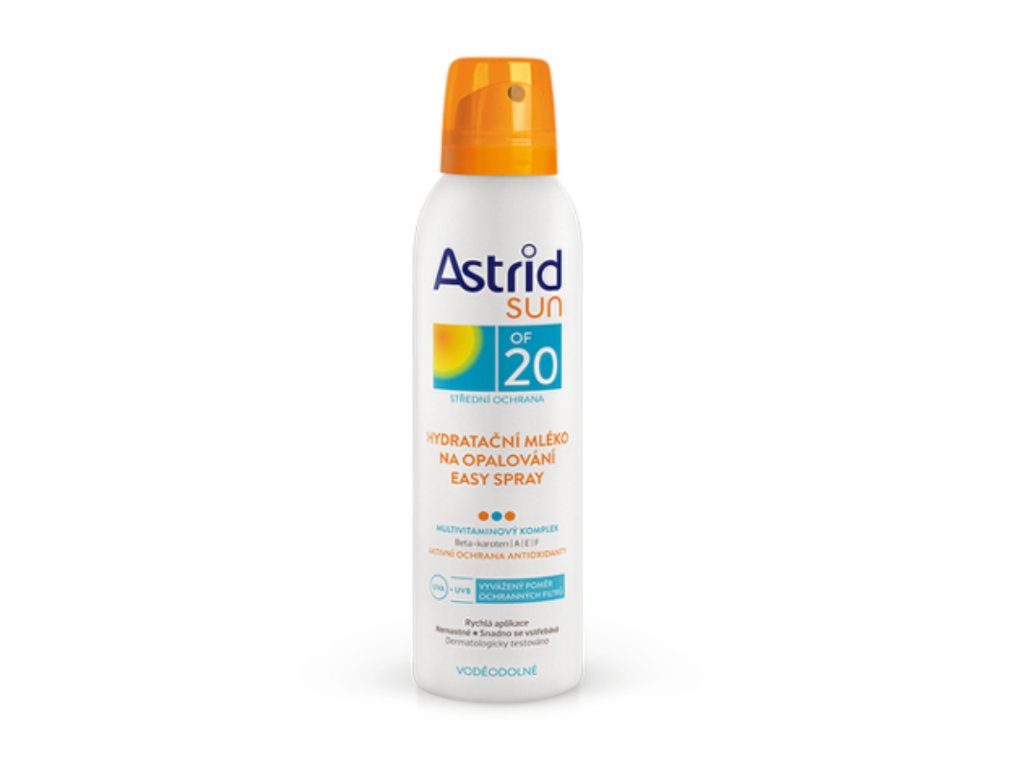 Sprej, 20 SPF, 150 mlHydratační mléko na opalování Astrid Sun Easy spray vám nabízí středně silnou ochranu před slunečními paprsky. Lehce se vstřebává a roztírá a díky složení obohaceném o D-panthenol a multivitaminový komplex (beta-karoten a vitaminy A, E, F) chrání pokožku před předčasným stárnutím a podporuje její hydrataci.
