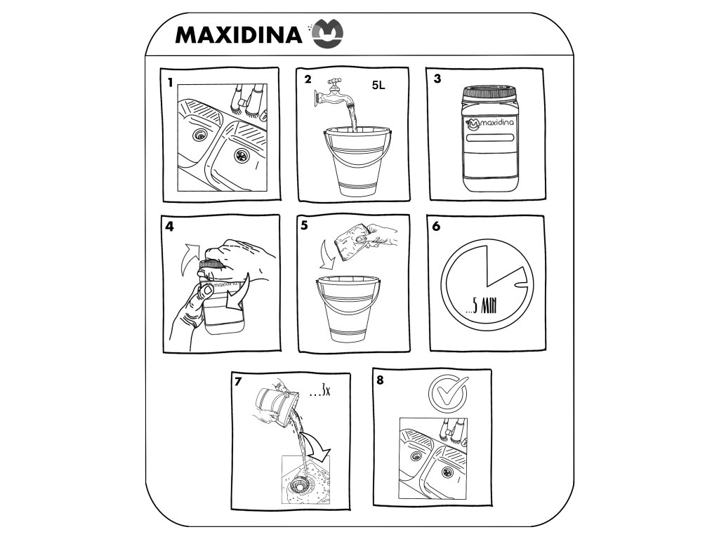1 rozpustný sáček vložte do 5 litrů vody, počkejte 5 minut na jeho rozpuštění a následně připravený roztok vylijte přímo do odpadu či jiného ošetřovaného místa.