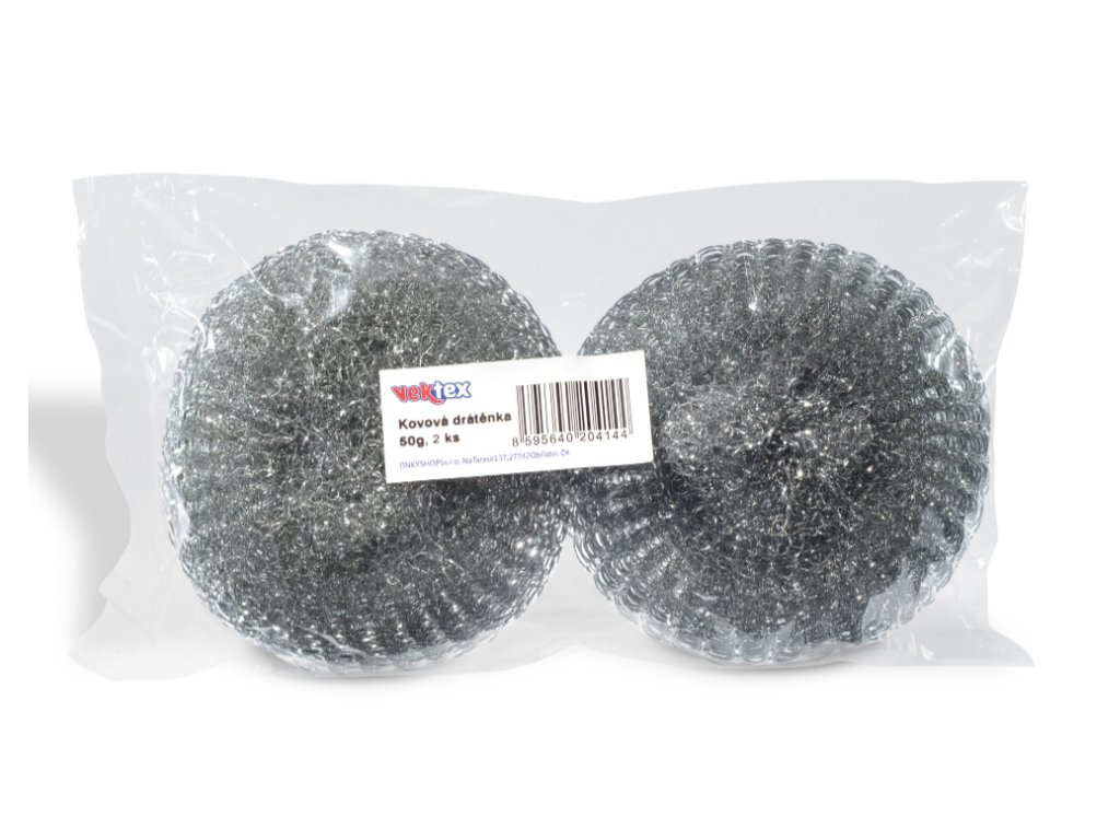 Pro důkladné vydrhnutí hrnců a pánví bez poškrábání, pletená ocelová drátěnka o váze 50 g.