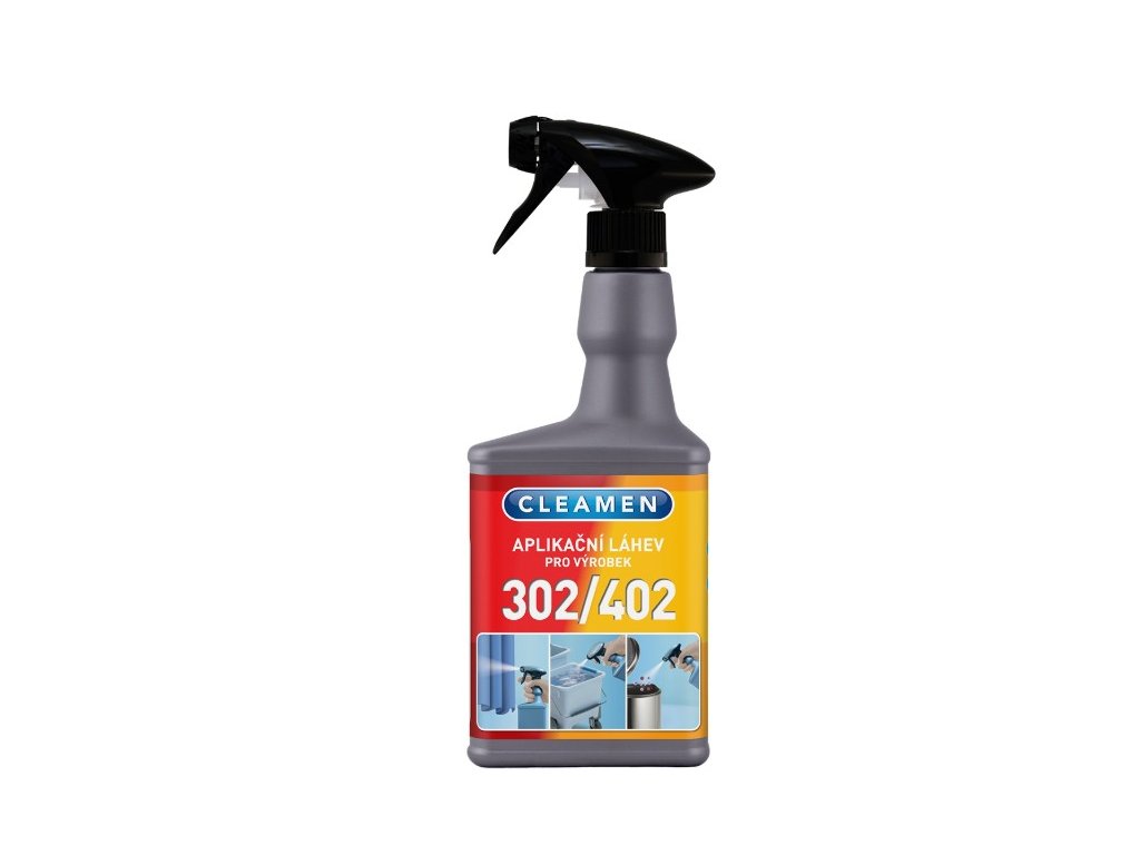 Láhev naplňte přiměřeným množstvím vody a poté nadávkujte CLEAMEN 302/402 dle doporučeného ředění uvedeného v tabulce na etiketě koncentrovaného prostředku. Našroubujte rozprašovač a rovnoměrně nanášejte na čištěný povrch nebo do úklidové utěrky.