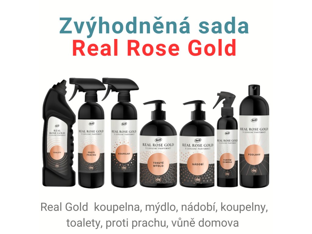 Luxusní parfemace z řady Real Gold, kdy se stejnou parfemací můžete nakoupit parfém domova, přípravek na podlahy, nádobí, WC, koupelny i přípravek proti prachu.